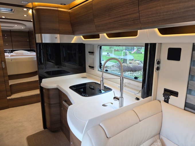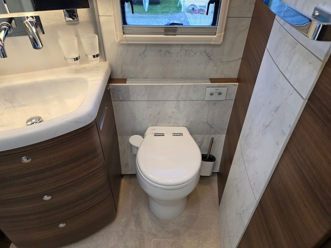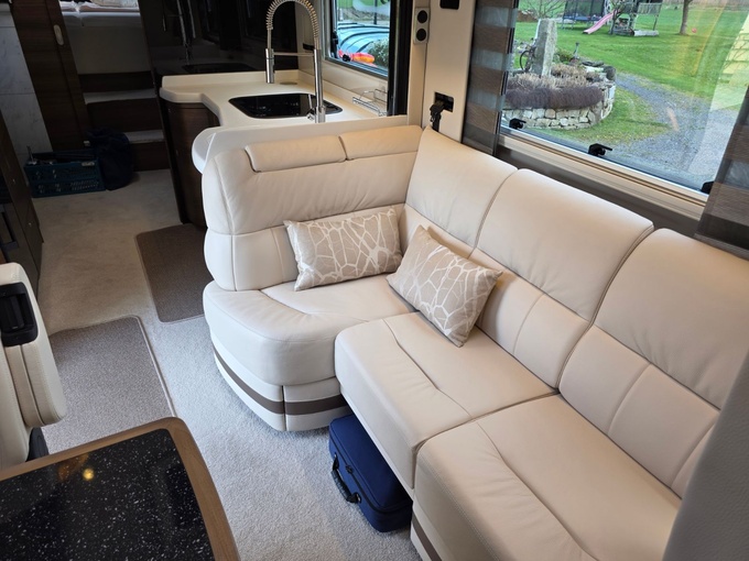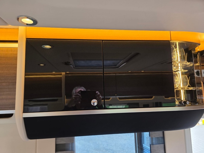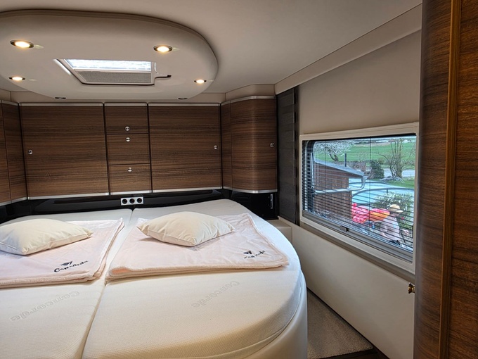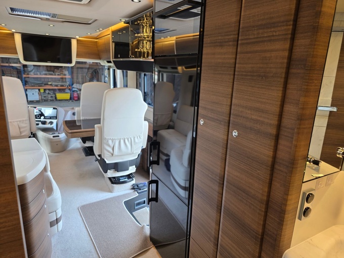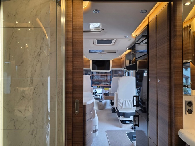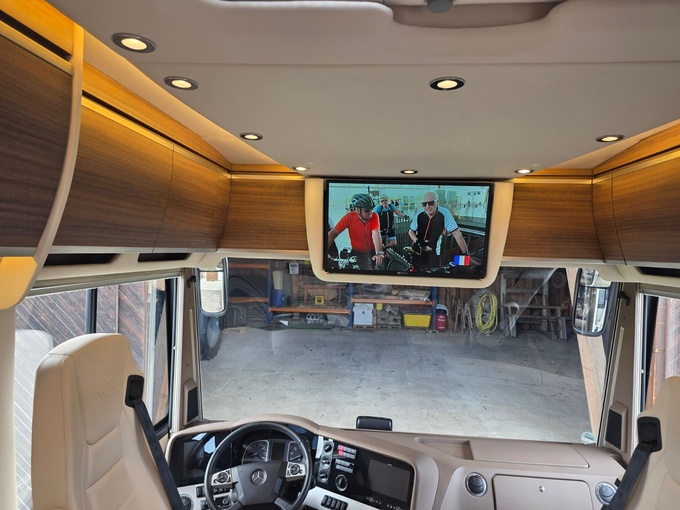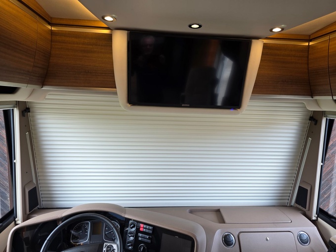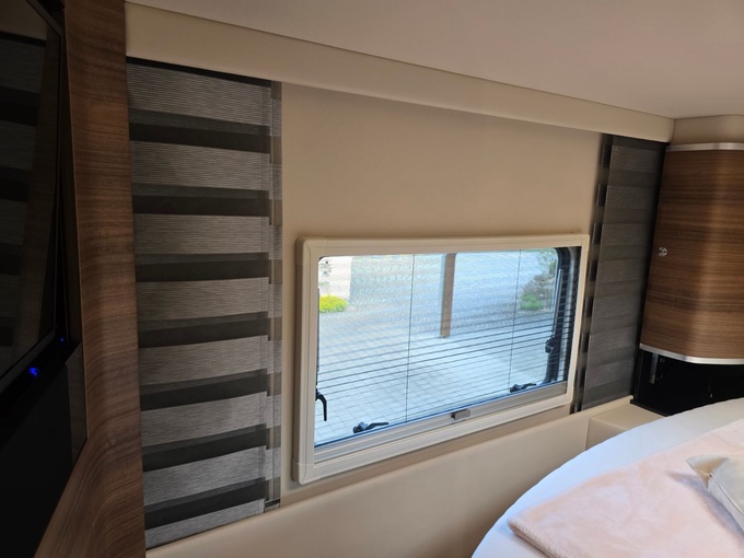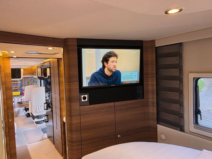 Sistema de TV por satélite (85 cm) con Full HD LED Smart TV de 32" en la unidad de pared sobre el parabrisas (no se puede bajar) y Full HD LED Smart TV de 32" en el dormitorio trasero