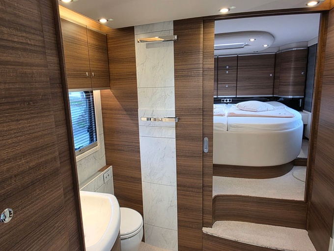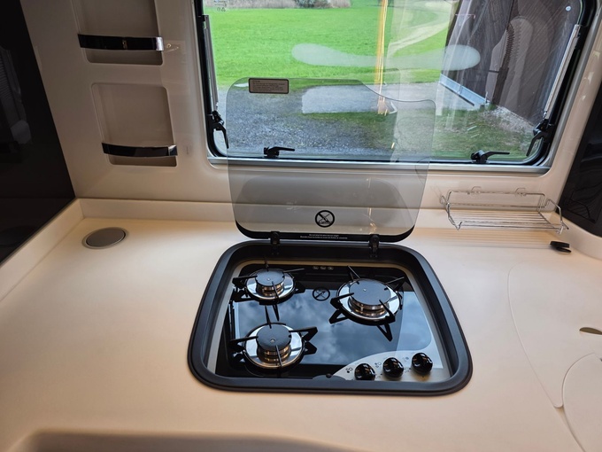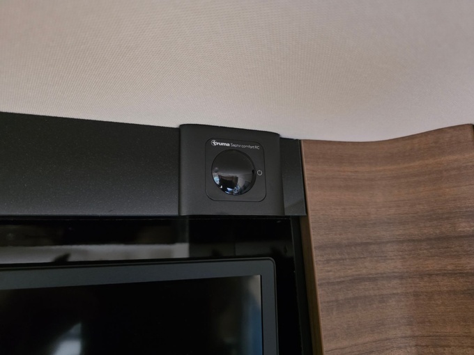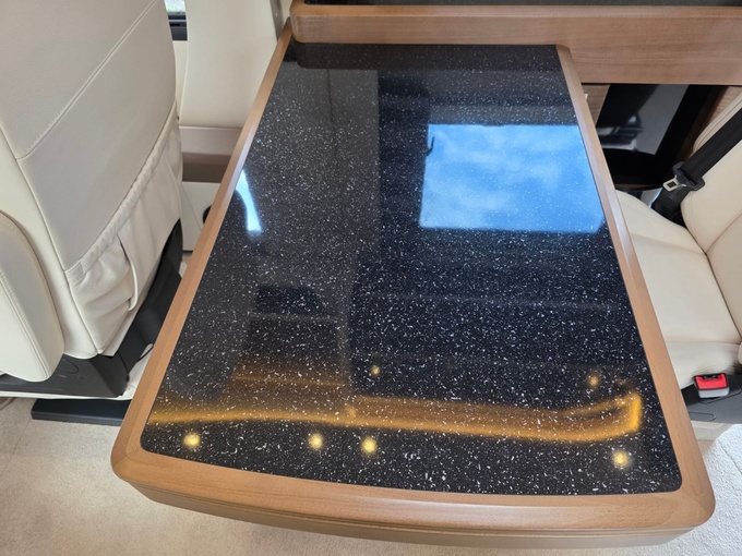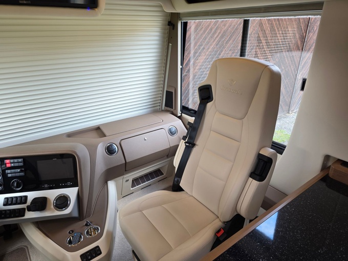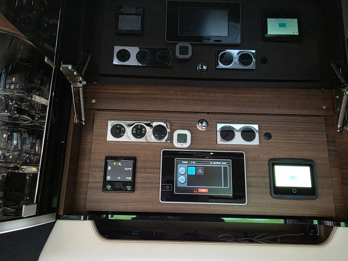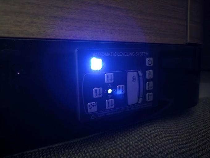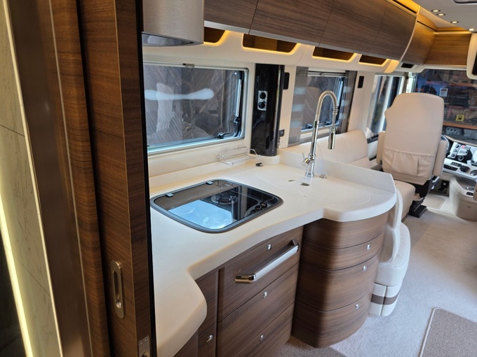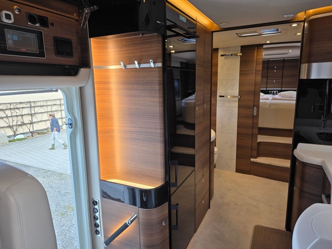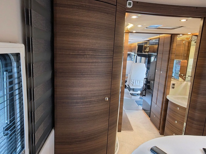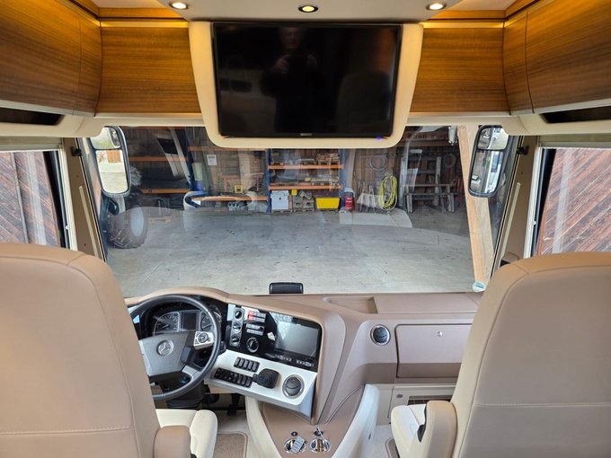 Sistema de TV por satélite (85 cm) con Full HD LED Smart TV de 32" en la unidad de pared sobre el parabrisas (no se puede bajar) y Full HD LED Smart TV de 32" en el dormitorio trasero