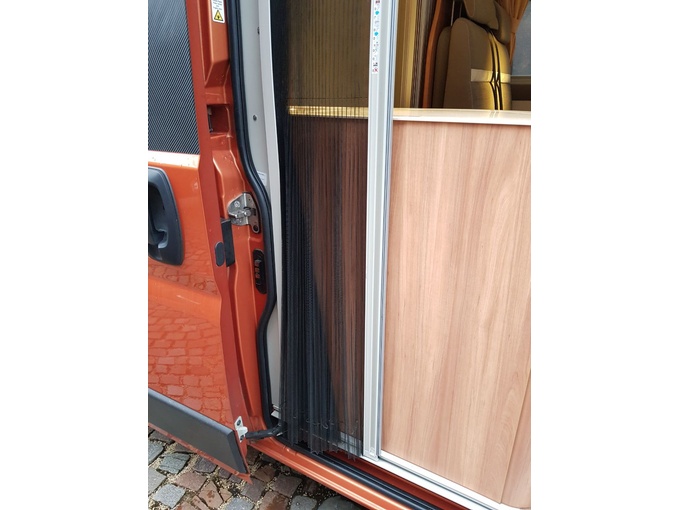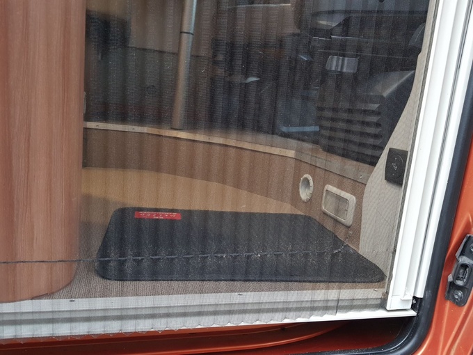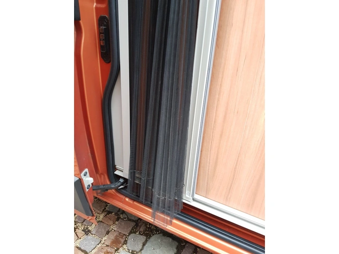 La banda elástica de la parte inferior de la puerta de mosquitera está rasgada, por lo que la puerta de mosquitera ya no puede replegarse completamente hacia el lado izquierdo.